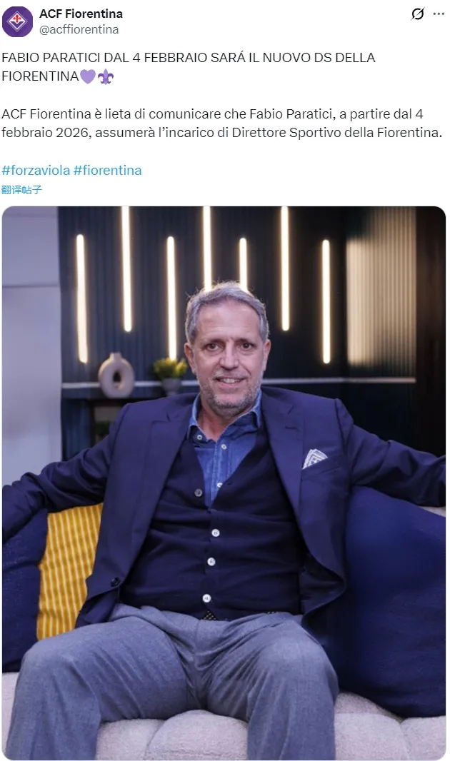 官方:佛罗伦萨宣布从热刺挖来了帕拉蒂奇,意大利人将从2月4日起出任紫百合的足球主管。